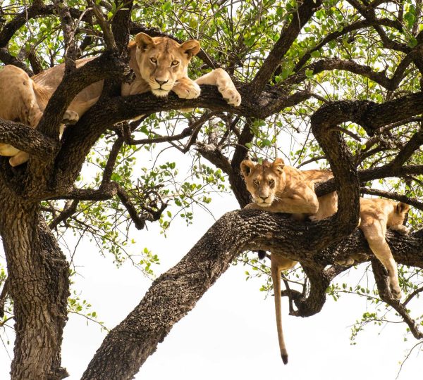But the undisputed stars are the park’s famous tree-climbing lions. Unlike most lions that stick to the ground, Manyara’s lions regularly climb into acacia and fig trees to rest, escape biting insects like tsetse flies, catch cooler breezes, or survey their territory. Spotting these majestic cats lounging on branches sometimes with cubs playfully scrambling is a rare and unforgettable highlight, making Lake Manyara one of the few places in Africa where this behavior is reliably observed.