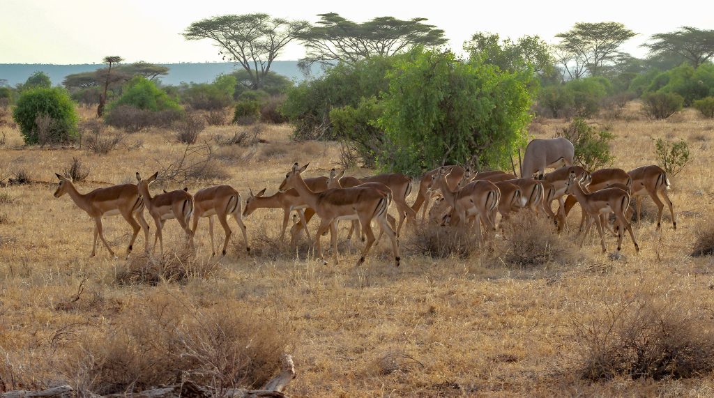 The long-necked gerenuk an extraordinarily elegant antelope that stands on its hind legs to reach the higher branches of acacia trees is one of the most distinctive and photogenic animals in Africa. Grevy’s zebra, the world’s largest and most endangered zebra species, roams the reserve in numbers rarely seen elsewhere. The reticulated giraffe the most strikingly beautiful of all giraffe subspecies, with its bold, clearly defined geometric coat pattern — is a breathtaking sight against the dry northern landscape. The Beisa oryx, with its long straight horns and dramatic facial markings, moves across the semi-desert with a proud, unhurried grace. And the Somali ostrich, distinguished by its blue neck, rounds out a collection of northern specialty species that makes Samburu one of the most rewarding wildlife destinations in all of Kenya.
