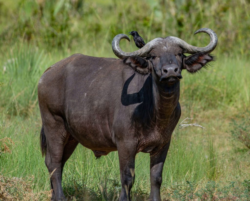 Among Africa’s most formidable animals is the African buffalo, a powerful and highly social species that roams Uganda’s savannahs in impressive herds. Often found grazing in wetlands, woodlands, and river valleys, buffalo are known for their unpredictable temperament and strong herd instincts.